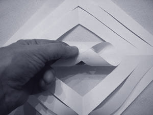 Draw a line close to the edge with one fold. Cut from the edge with two folds, parallel to the cut edge of the paper, as shown in picture two below. Make four cuts, stopping when you get to the line you drew.